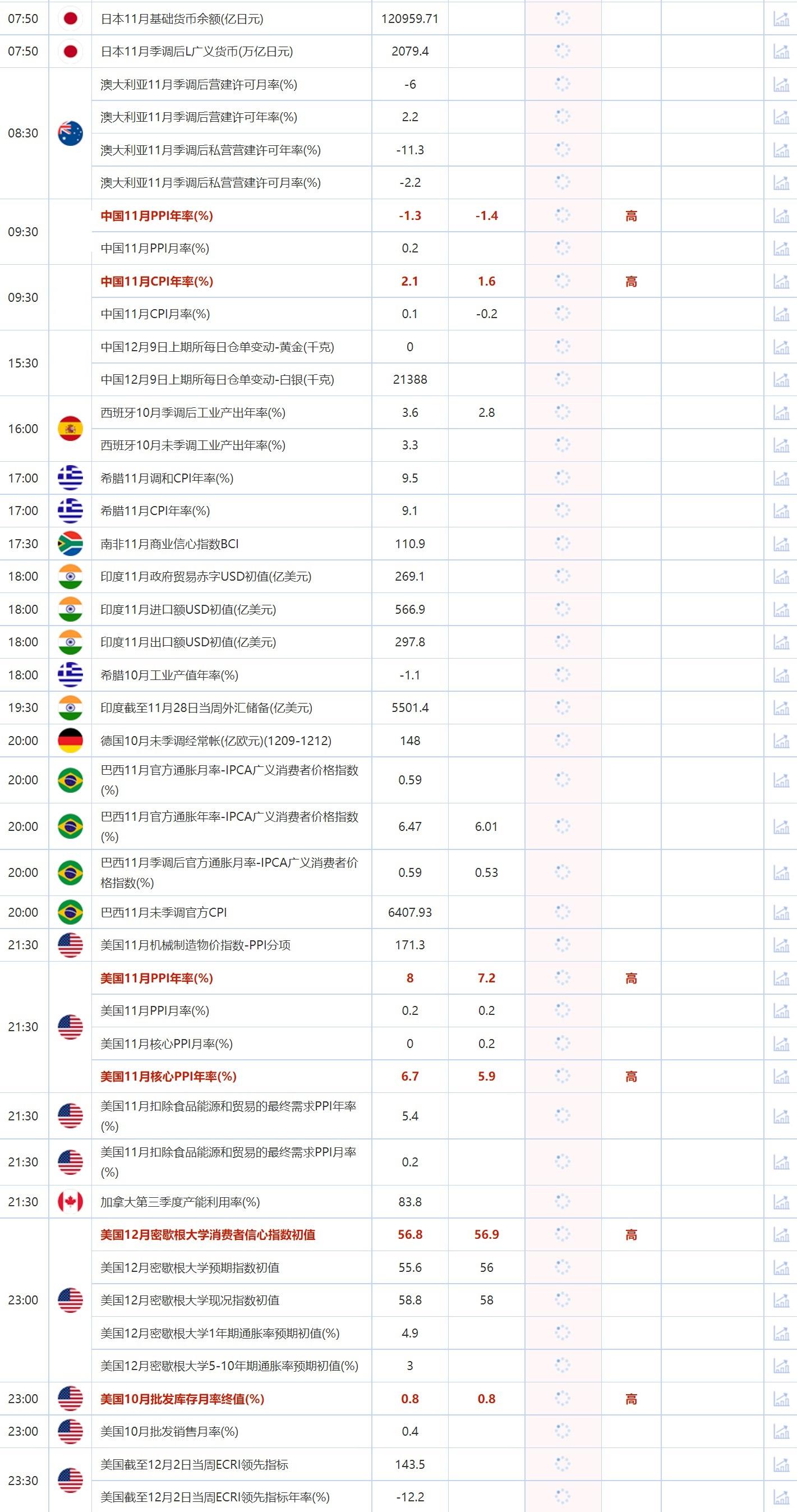 09:30 中国11月PPI年率(%) , 前值 -1.3 , 预期值 -1.4 , 公布值:待发布
