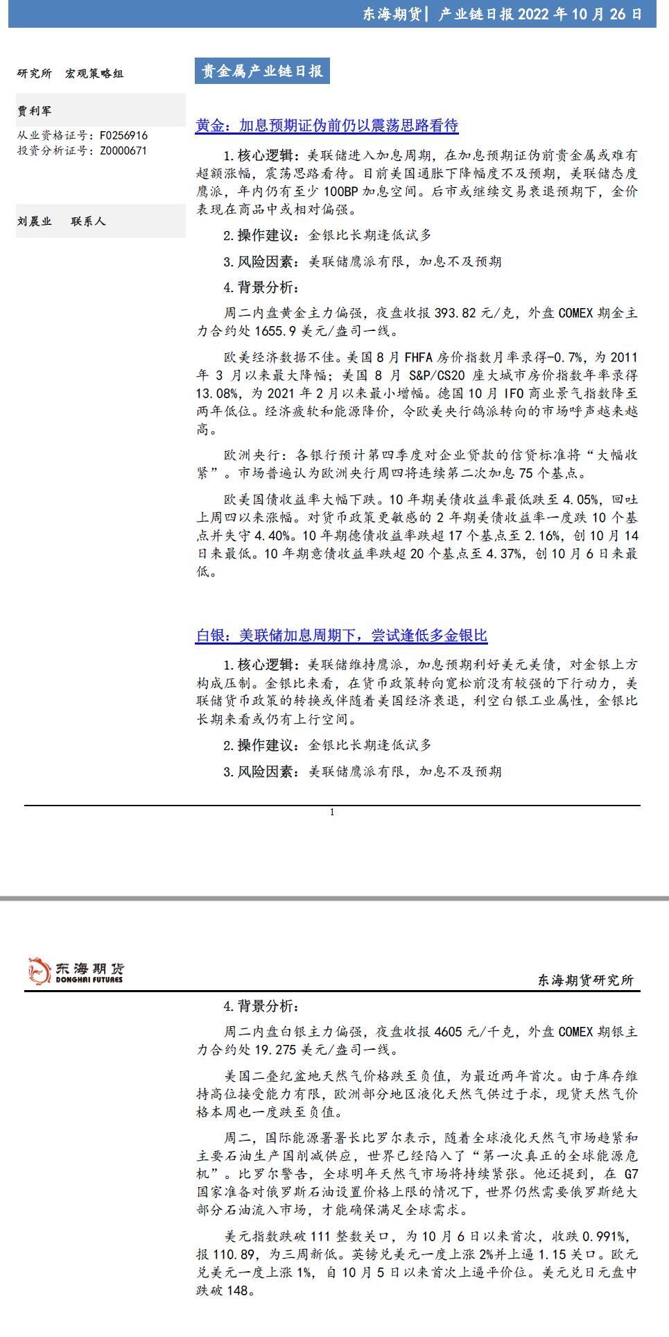 【东海期货10月26日产业链日报】贵金属篇:美元走弱,金银宽幅震荡 Oct 26,2022 黄金操作建议: 金银比长期逢低试多白银操作建议: 金银比长期逢低试多免责声明:本报告立足于结合基本面及技术面对市场价格运行趋势及轮廓进行整体判断,提示可能存在的投资风险与投资机会。报告中的信息均源自于公开材料,我公司对这些信息的准确性和完整性不作任何保证。报告仅作参考之用,在任何情况下均不构成对所述期货品种的买卖建议,我们也不承担因根据本报告操作而导致的损失。 东海期货公司授权文本由“专注期货开户交易及专业行情分析资讯网站”:【一期货 www.1qh.cn】转发