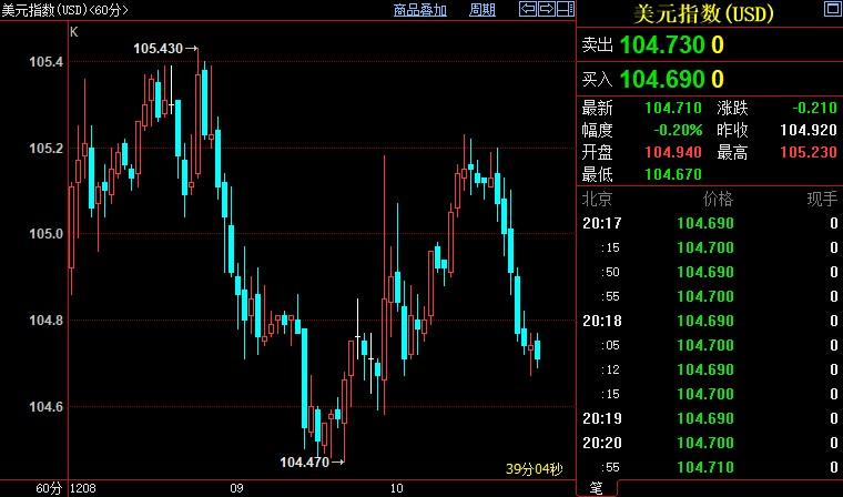 北京时间20:20,现货黄金下沉0.18%至1793.90美元/盎司;COMEX期金主力合约下跌0.29%至1805.7美元/盎司;美元指数下跌0.22%至104.705。金价日内最大跌幅0.65%。
