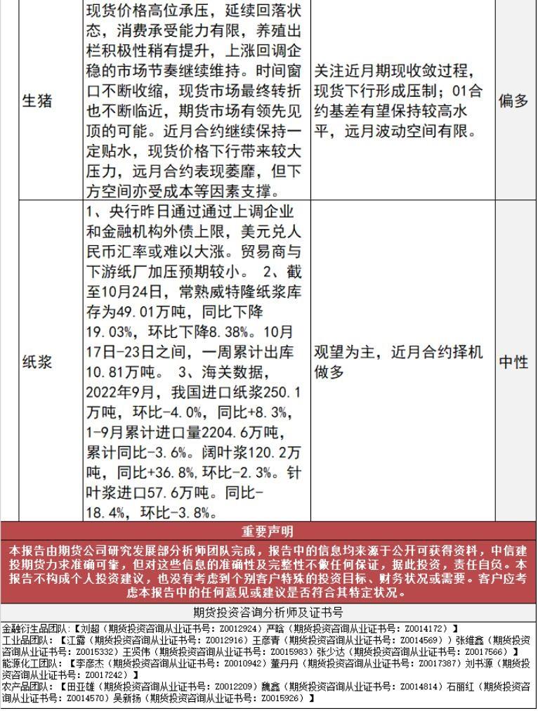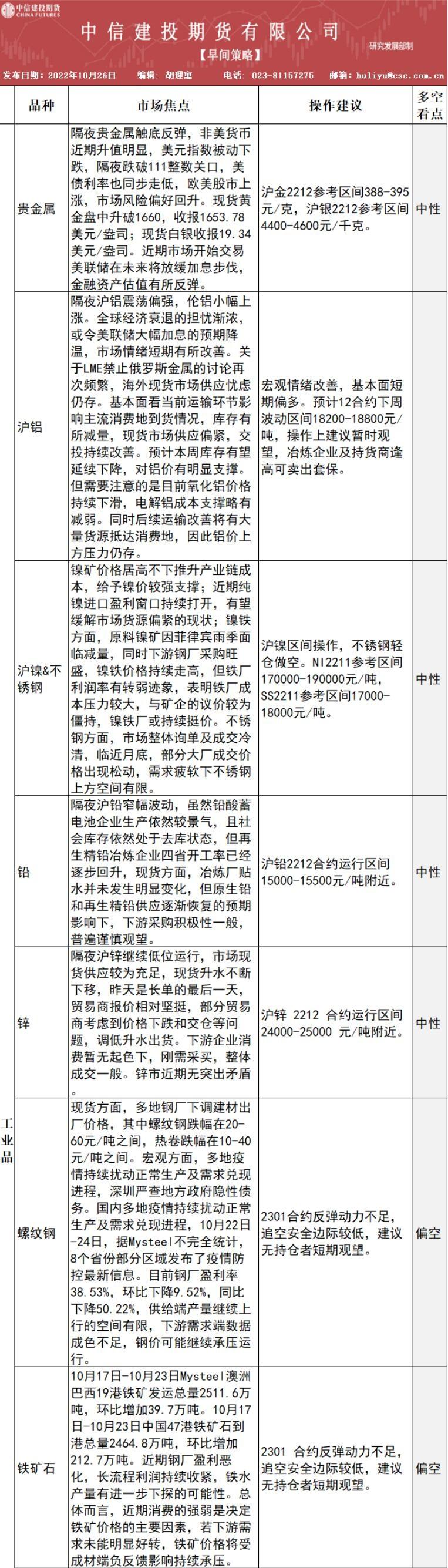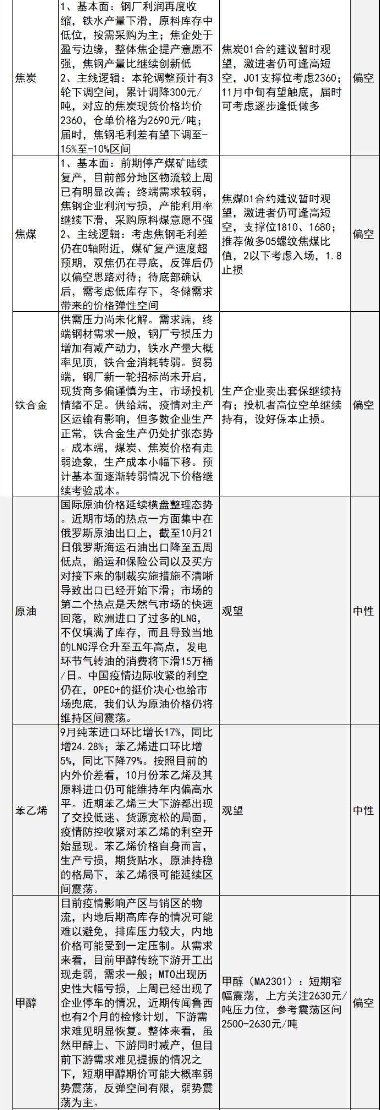 螺纹钢:现货方面,多地钢厂下调建材出 厂价格,其中螺纹钢跌幅在20- 60元/吨之间,热卷跌幅在10-40 元/吨之间。宏观方面,多地疫 情持续扰动正常生产及需求兑现 进程,深圳严查地方政府隐性债 务。国内多地疫情持续扰动正常 生产及需求兑现进程,10月22日 -24日,据Mystee 1不完全统计, 8个省份部分区域发布了疫情防 控最新信息。目前钢厂盈利率 38.53%,环比下降9.52%,同比 下降50.22%,供给端产量继续上 行的空间有限,下游需求端数据 成色不足,钢价可能继续承压运 行。