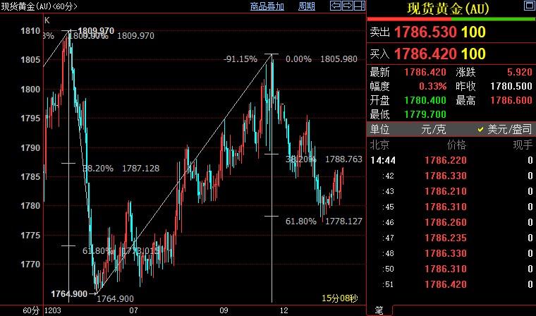 北京时间14:45,现货黄金上涨0.30%至1786.43美元/盎司;COMEX期金主力合约上涨0.27%至1797.2美元/盎司;美元指数下沉0.13%至104.877。