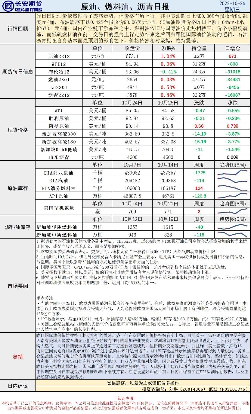 长安期货原油早评:建议短差为主或谨慎偏多操作 Oct 26,2022 10月26日,长安期货发布原油早评,认为原油将欧洲能源危机在天然气供给过剩下或缓解,关注EIA库存数据,建议短差为主或谨慎偏多操作。 长安期货公司授权文本由“专注期货开户交易及专业行情分析资讯网站”:【一期货 www.1qh.cn】转发